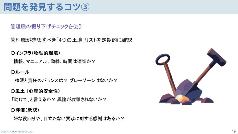 問題の震源地を特定するフレームワークでは、具体的にどのような「環境」を疑えばよいのでしょうか。ゼミでは、管理職が定期的に確認すべき「4つの土壌」リストが紹介されました。