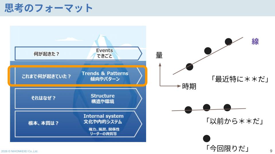 病棟でのインシデントや、スタッフの好ましくない態度。これらはすべて、水面から突き出た氷山の一角である「できごと(Events)」に過ぎません 。講義では、この表面的な事象に対し「反応・火消し」をするだけでは不十分であることが強調されました 。真のマネジメントとは、水面下にある「これまで何が起きていたか(傾向やパターン)」を見出し、さらに「それはなぜか(構造や環境)」、「根本、本質は何か(文化や内的システム)」へと深く潜っていく思考プロセスにあります。
